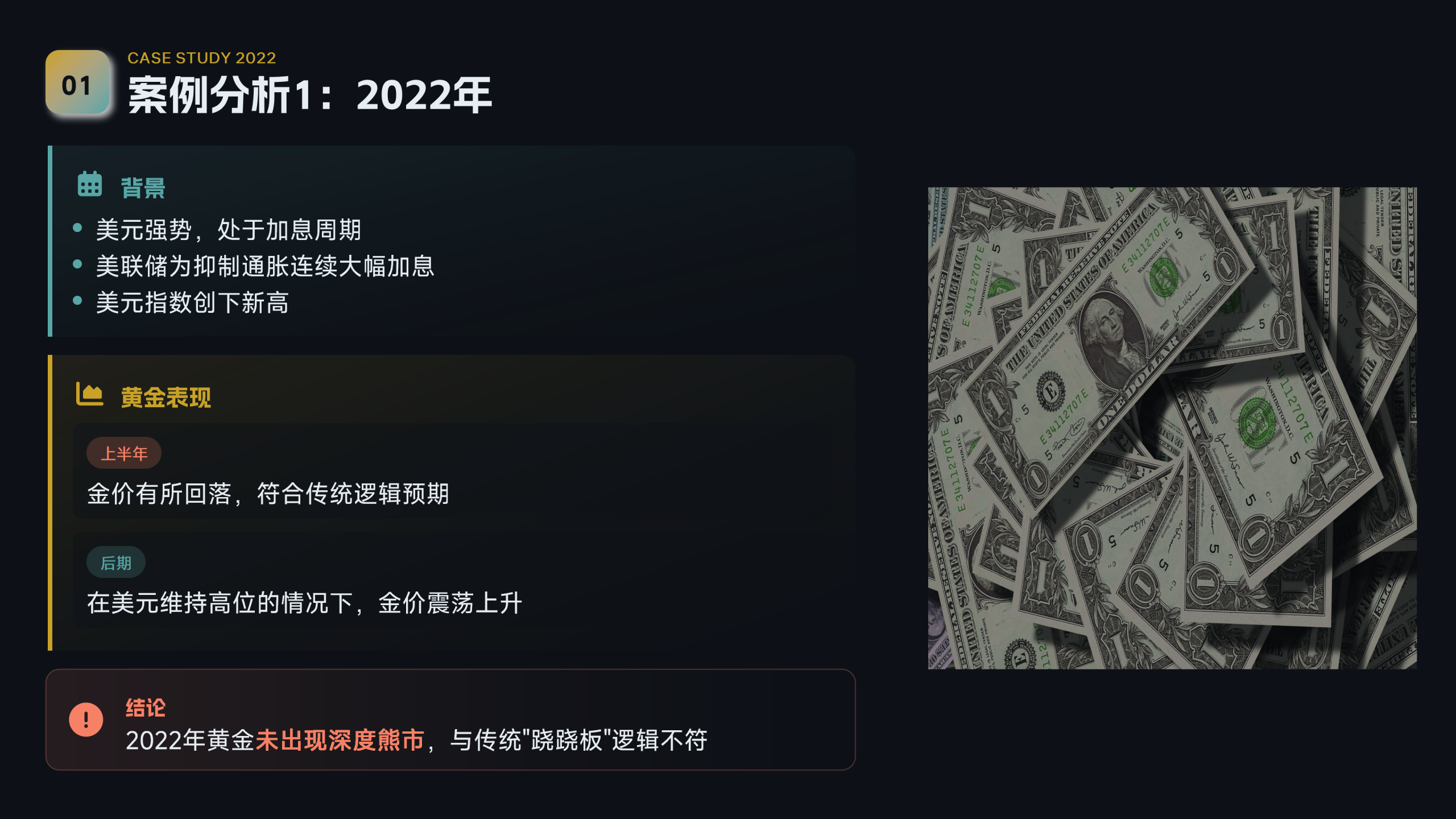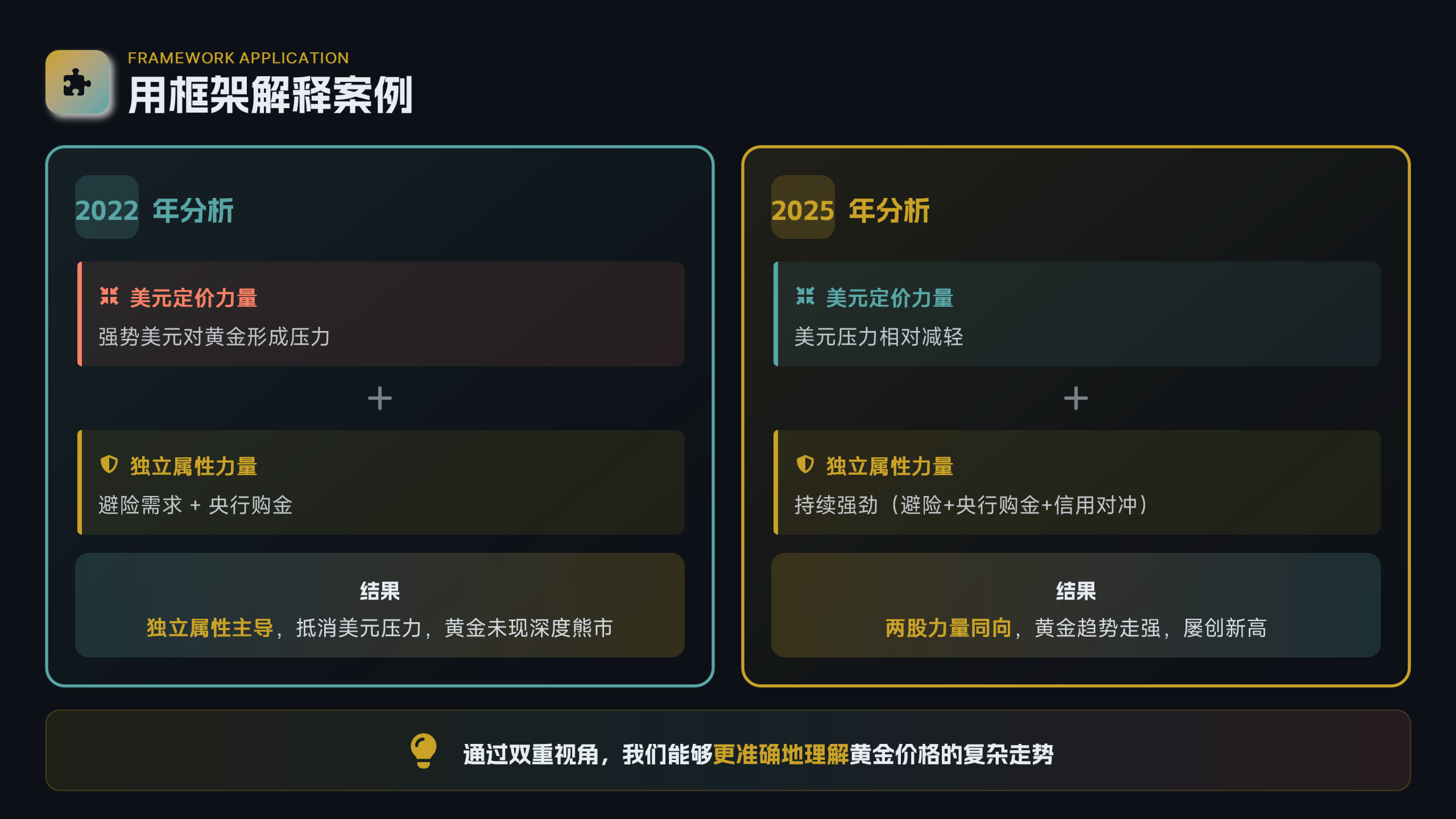 用这个框架,再回头看那两个阶段就很清楚了。2022 年黄金为什么没有被美元完全压下去?