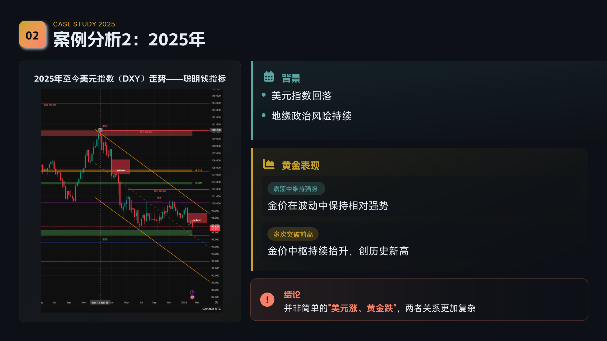 你会发现:22 年和 25 年,并不是简单的“美元涨、黄金跌”。如果只用“跷跷板”这一套,其实很多行情是解释不通的。
