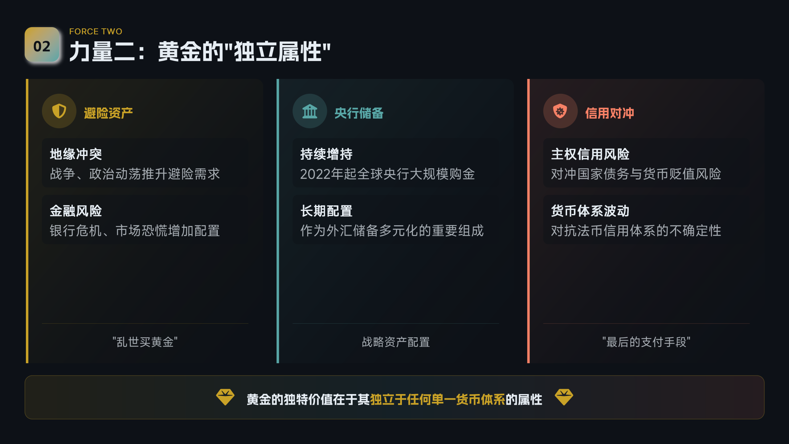 因为当时主导市场的,是黄金的独立属性。避险需求叠加央行购金趋势,抵消了美元加息带来的部分压力。