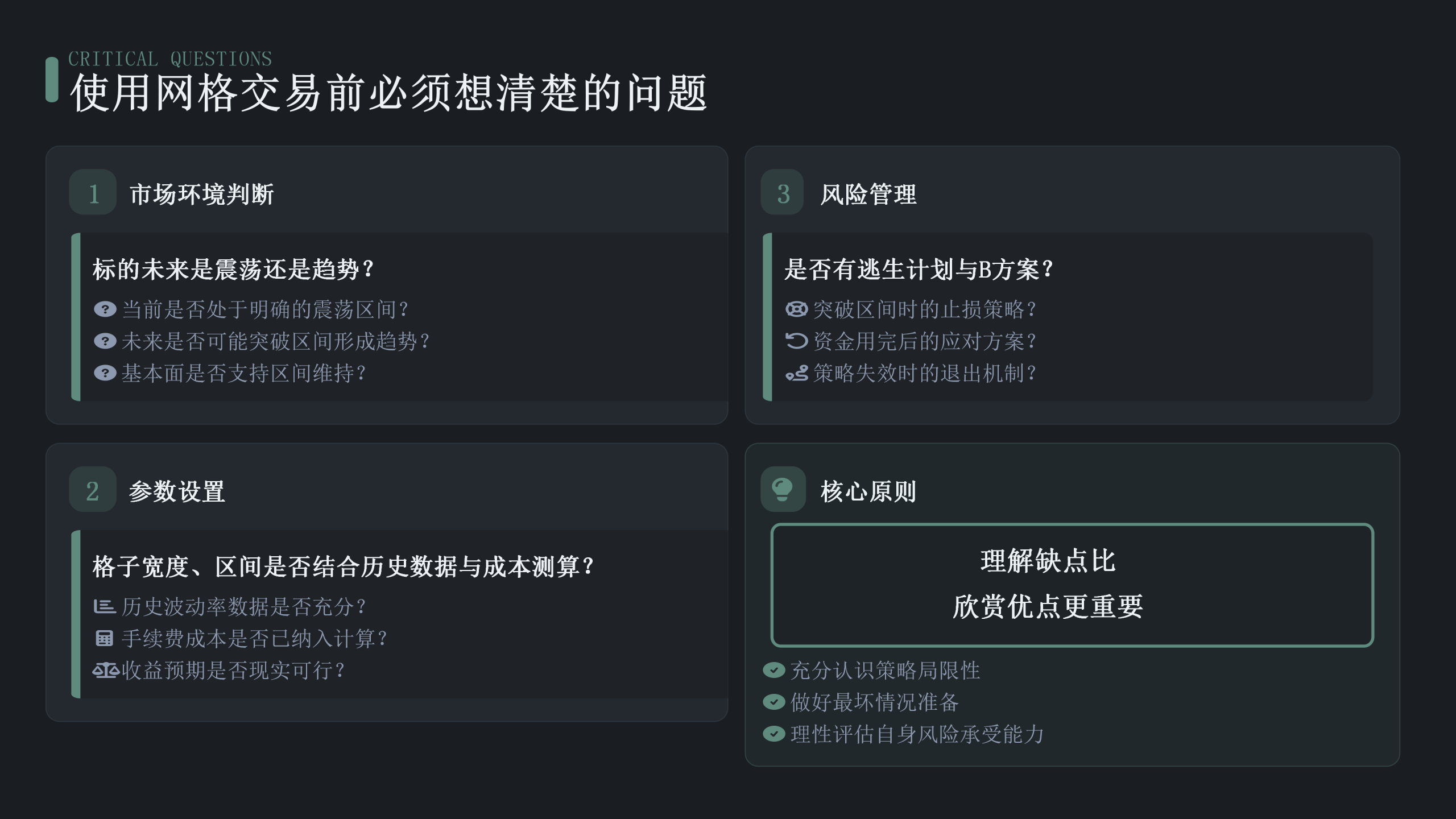 格子宽度和区间结合历史数据、算好成本了吗?以及市场不按剧本走时,逃生计划和B方案准备好了吗?