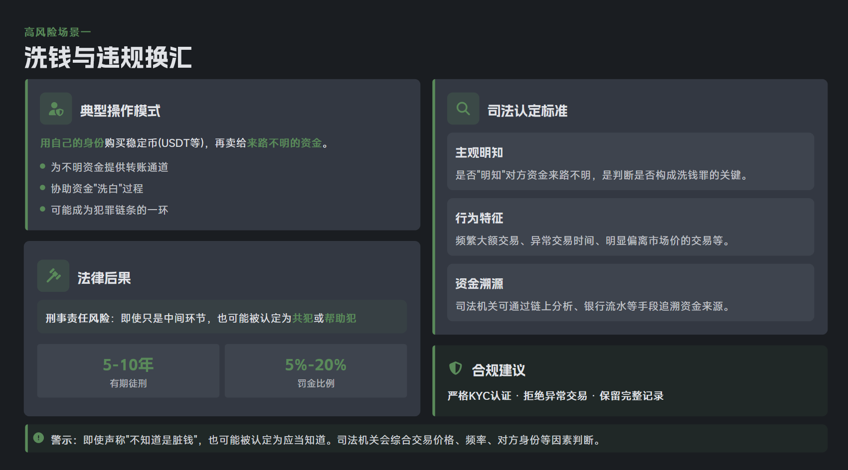比如用自己身份买 USDT,再卖给来路不明的资金,这就是在给脏钱提供通道,哪怕只是中间环节,也可能被认定为共犯或帮助犯,面临 5-10 年有期徒刑和 5%-20% 的罚金。
