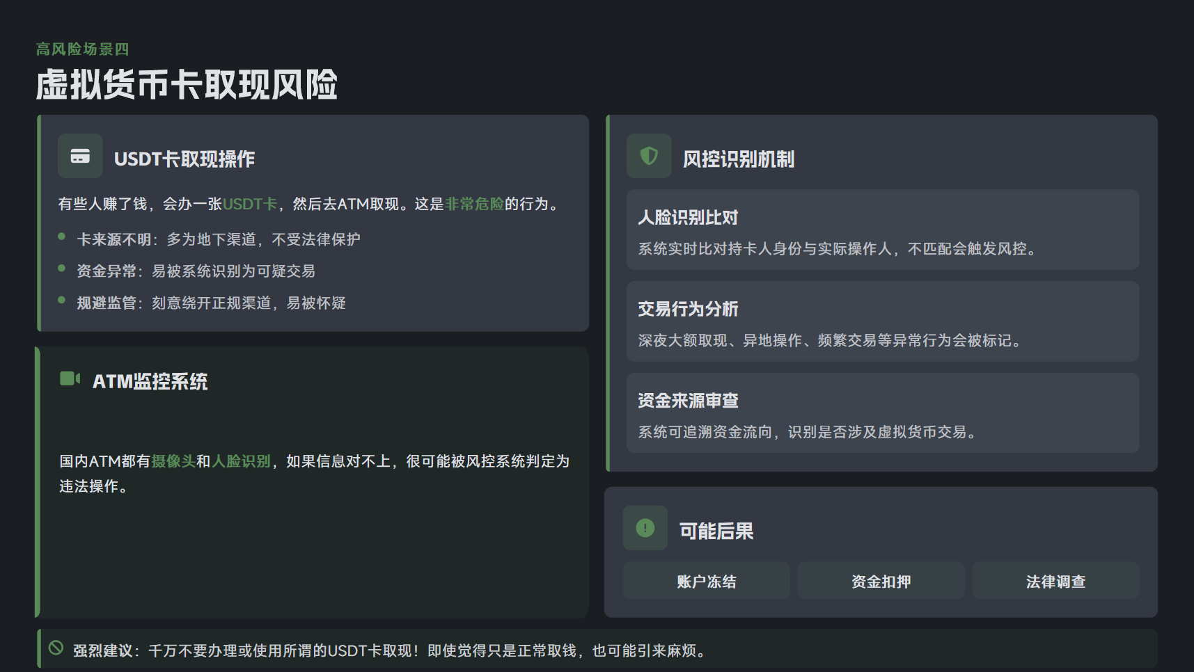 国内 ATM 都有摄像头和人脸识别,信息对不上就可能被判定为违法操作,导致账户冻结、资金扣押甚至法律调查。