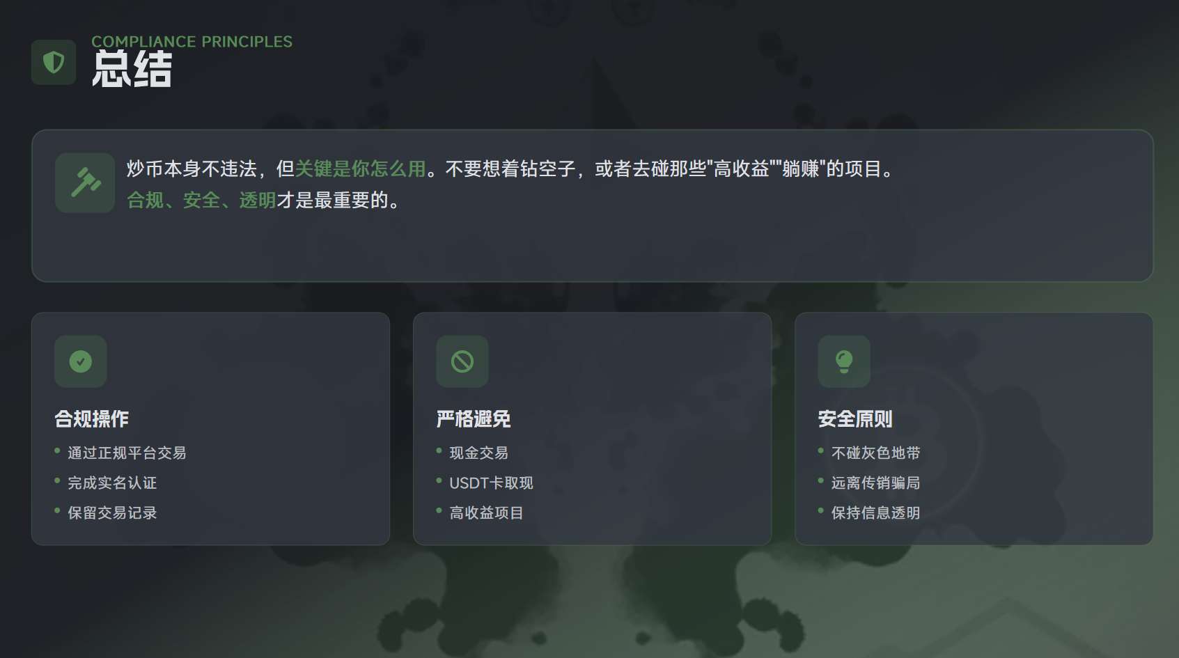 炒币本身不违法,但关键是你怎么用。大家不要想着钻空子,或者去碰那些”高收益””躺赚”的项目。合规、安全、透明才是最重要的。