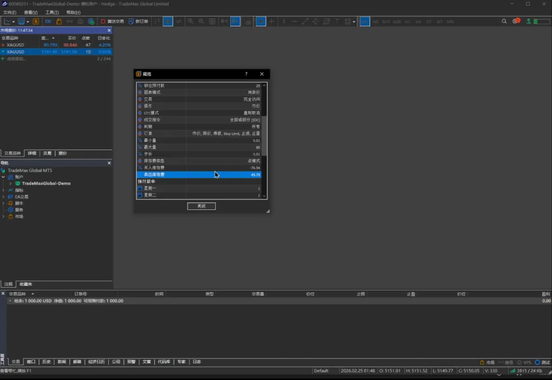 也可以看得到里边的内容,比如这里显示点差是浮动的,还有买入库存费和卖出的库存费,买入库存费是指我们持有一手黄金过夜那他所需要支付的隔夜费用就是79刀。