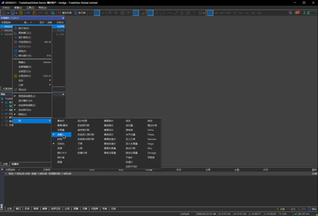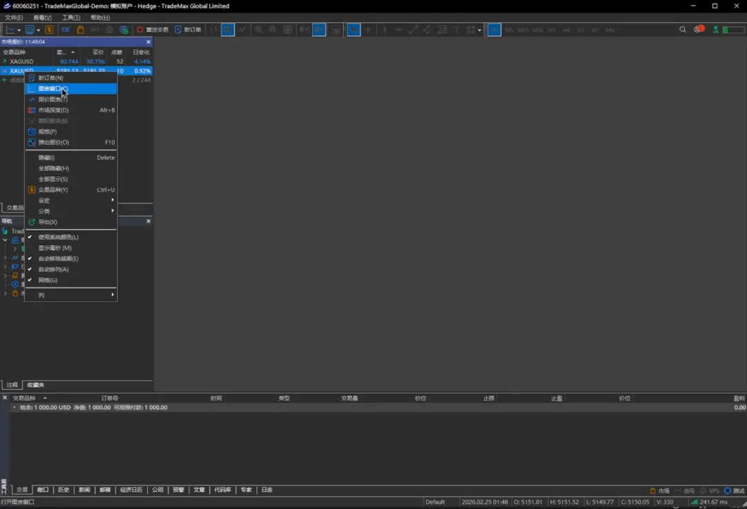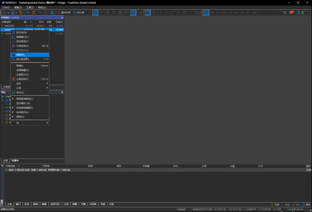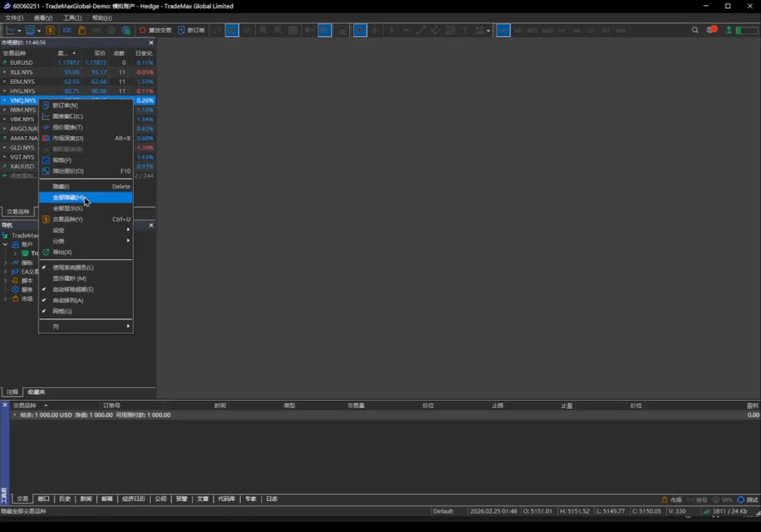 那登录成功之后我们看到这左上方这些交易品种,它非常的多,我们如果不想看我们可以把它们直接点全部隐藏。