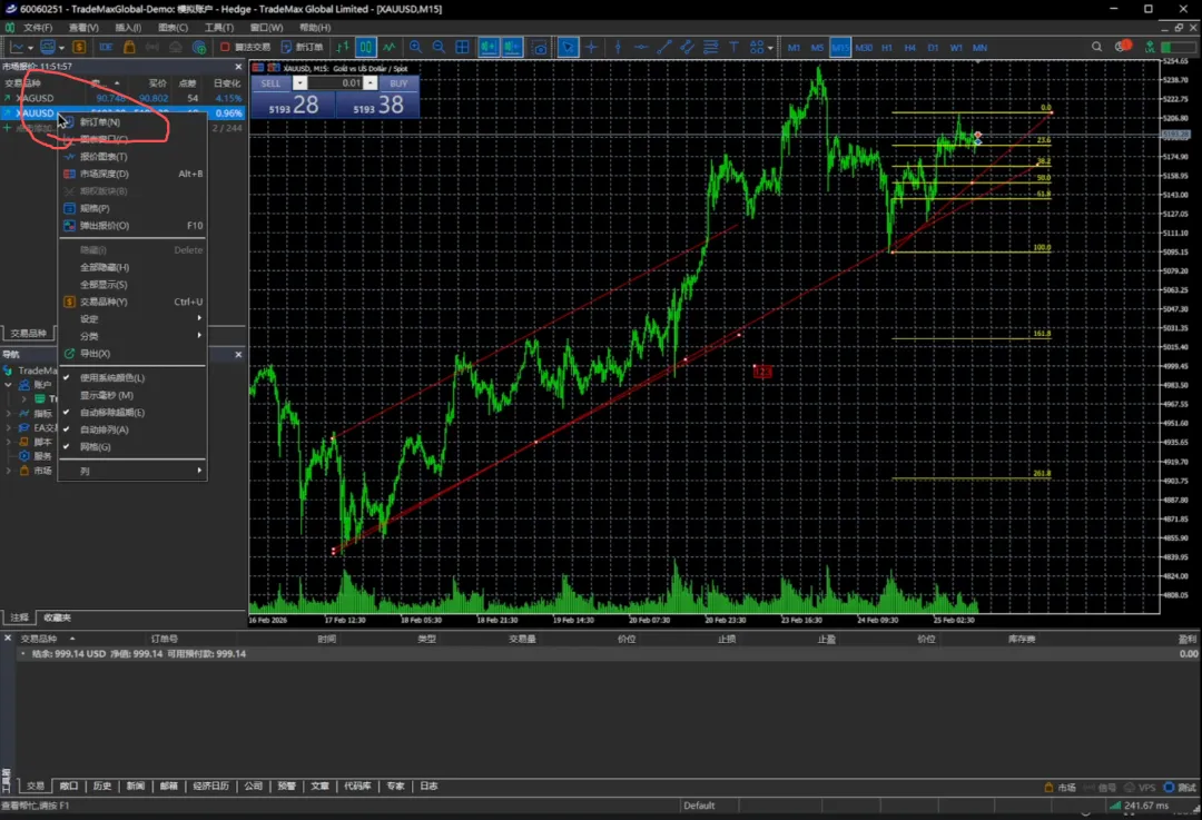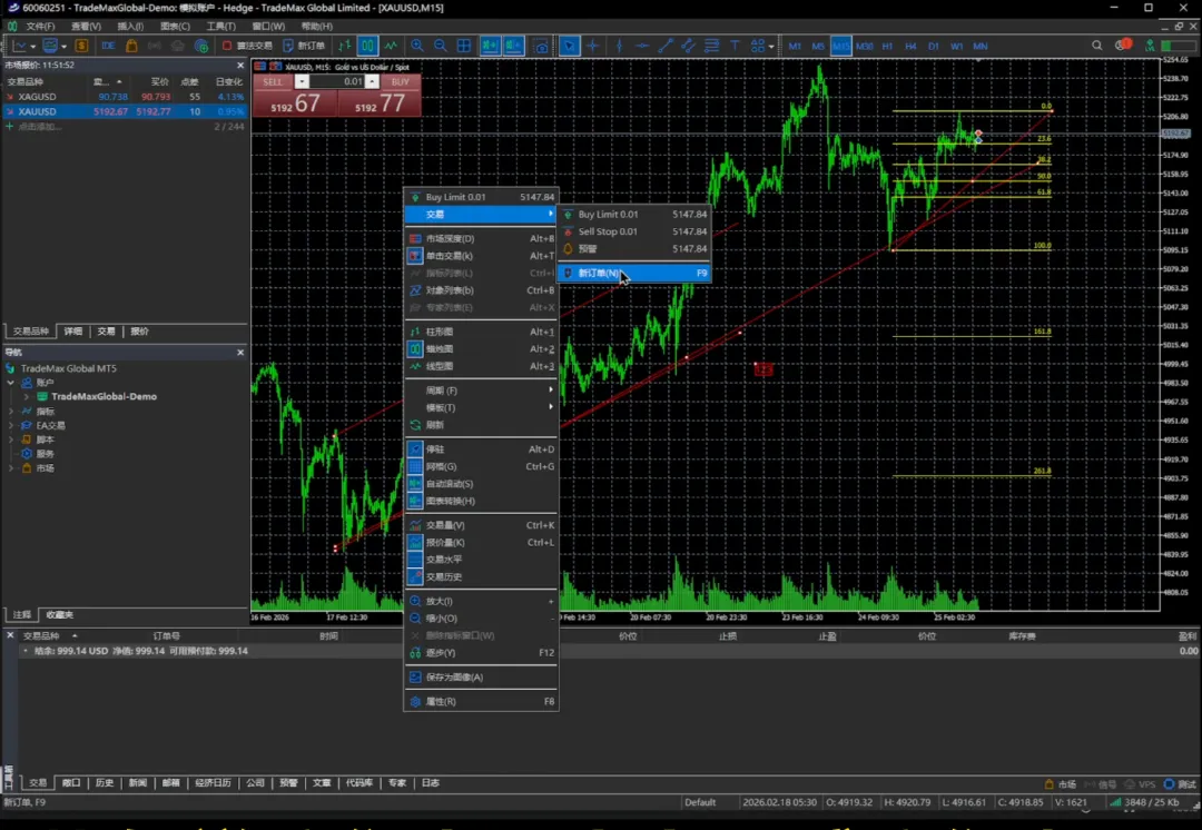 那如果我们对价格不满意,我们也可以在市场报价里边去进行一个限价单的一个挂单,我给大家操作一下,比如说我们点击空白区域,我们交易,我们点这个新订单。