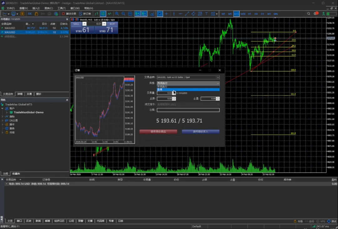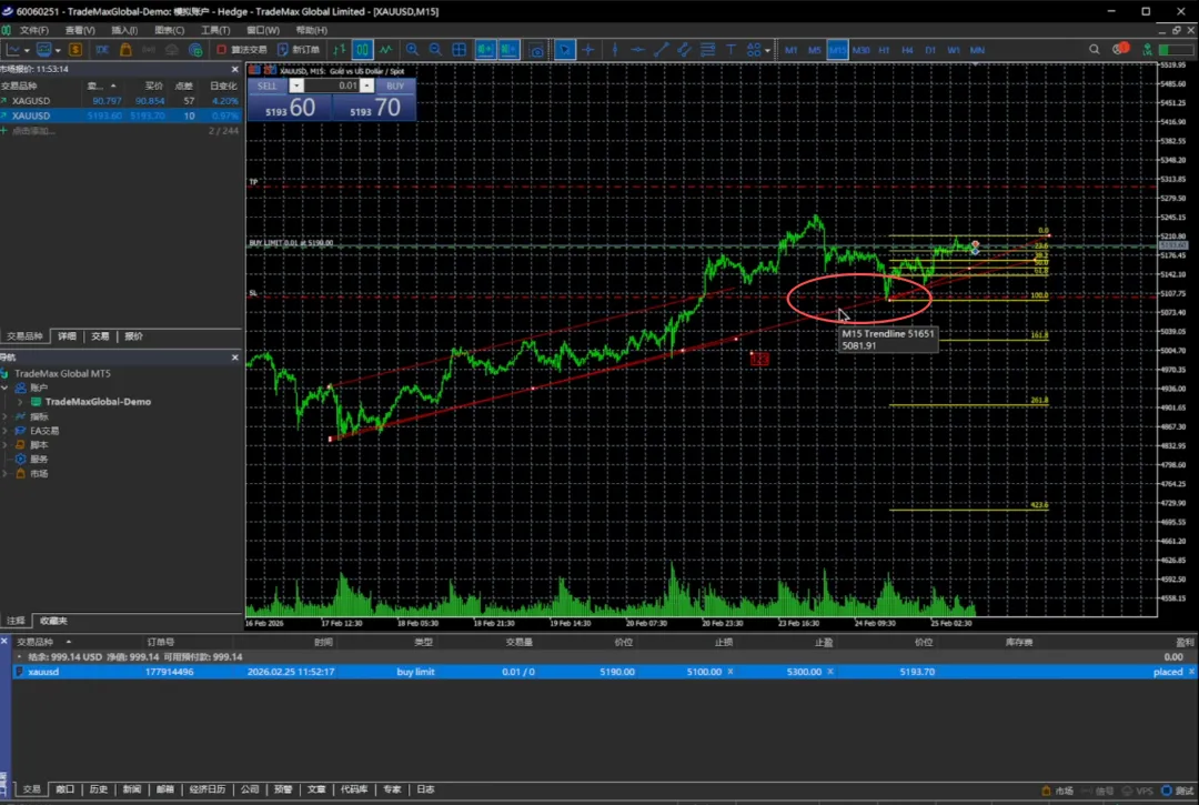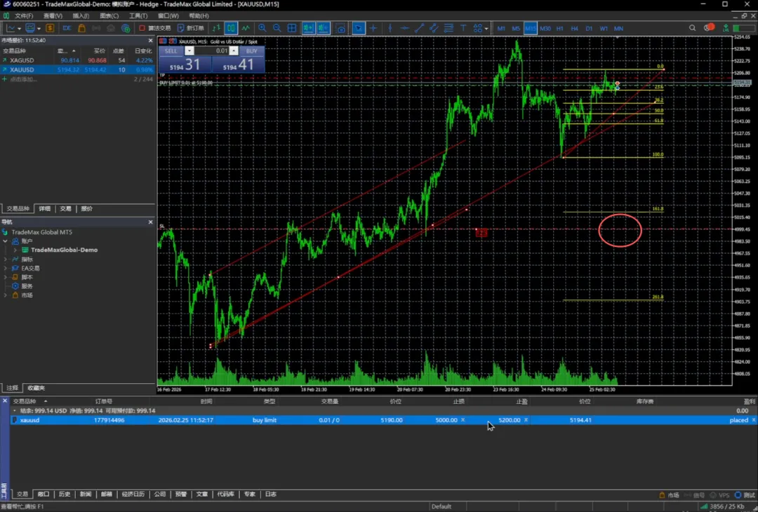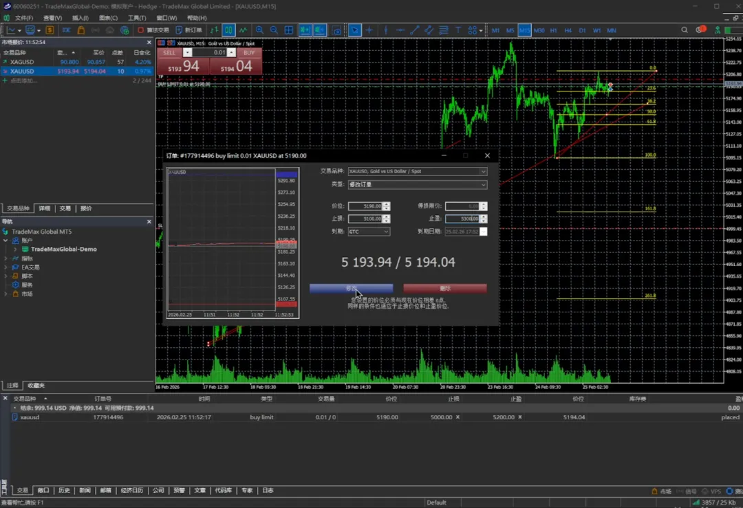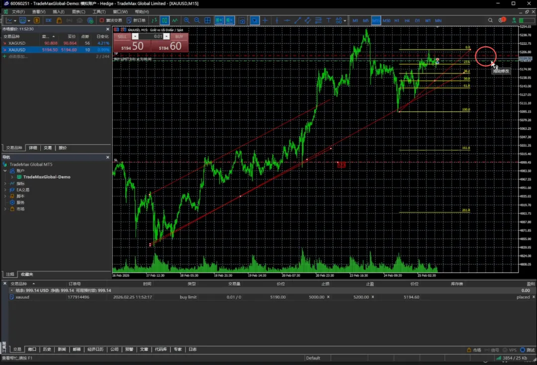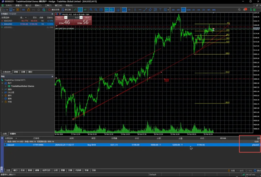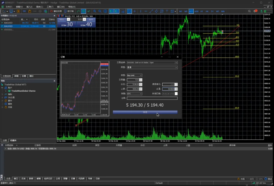 交易量还是0.01手,我们挂的价位可以是5100或者5190,止损可以放在5000,止盈放在5200,我们选择发送。