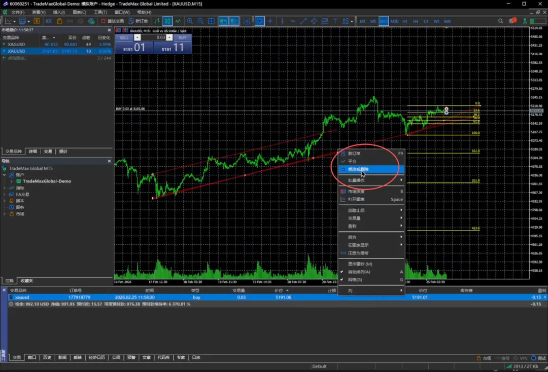 可以看到我们这里持有的一个仓位是0.03手,点击这个修改或删除。