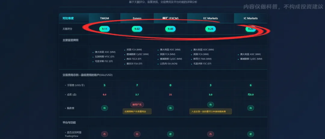 5个平台都在9分以上,整体评分都比较高,福汇评分最高9.4。