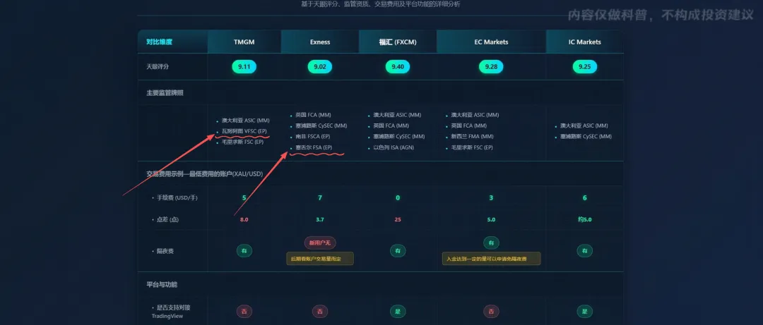 最后说下大家关心的平台服务,这个评级以10 分为标准的话,根据团队实际接触,TMGM的服务最高效,最细致,EC,Markets 和福汇,整体也可以,Exness 和 IC Markets的售后人员,数量较少,回复较慢。