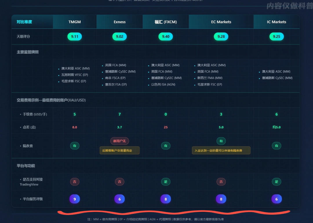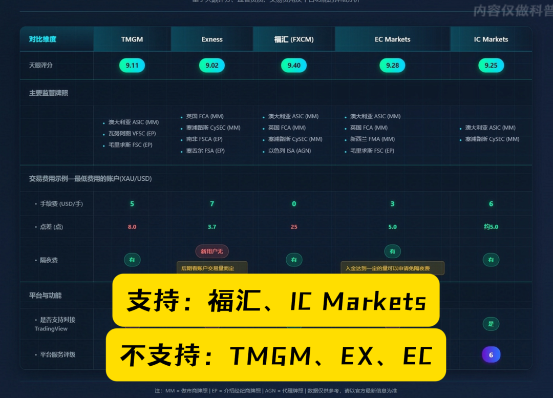 不同平台的交易成本,这里以最低费用的账户,黄金XAUUSD为例,EC成本最低,其次TMGM,IC,EX,差不多,福汇高一些需要点差25。